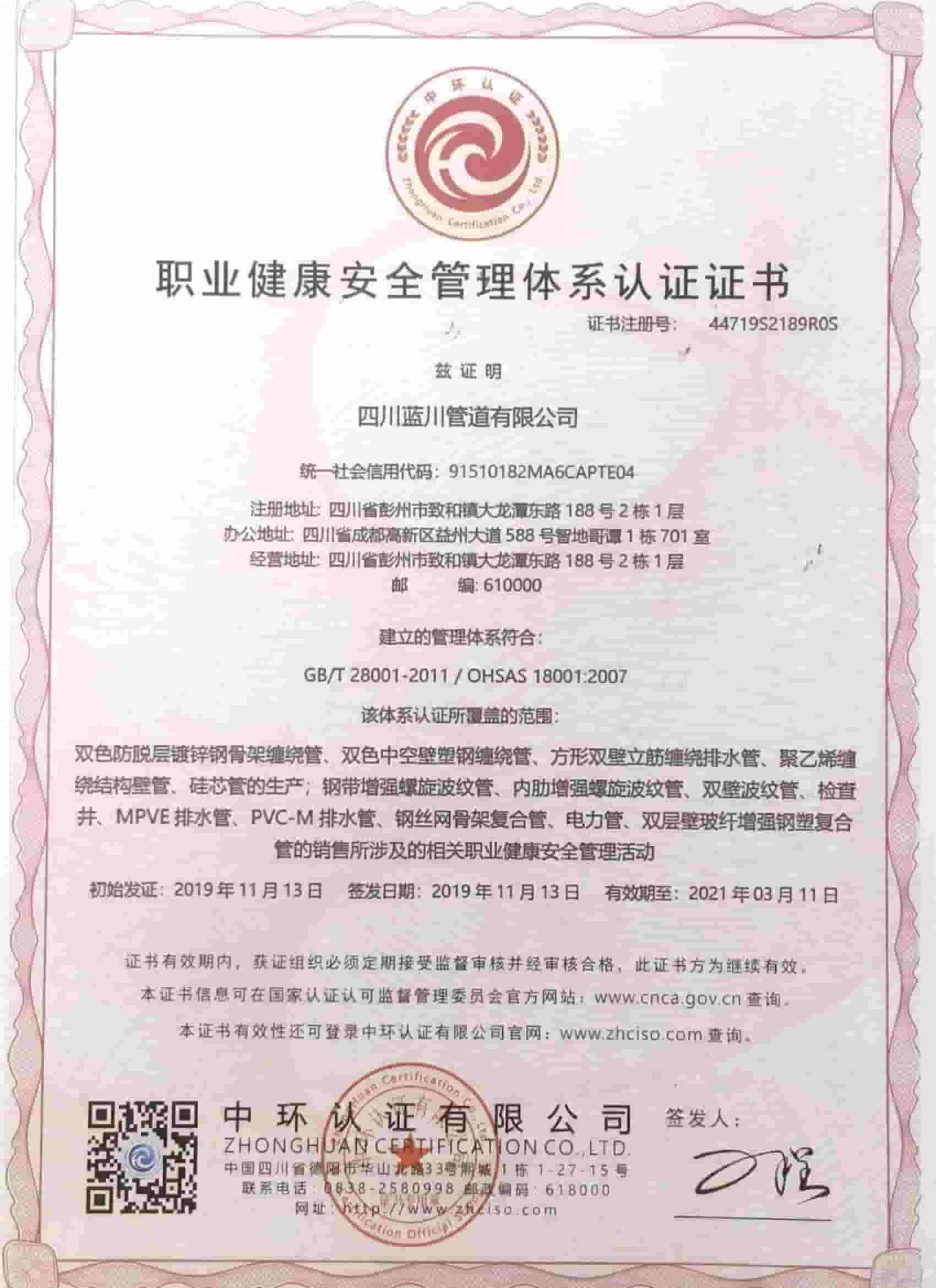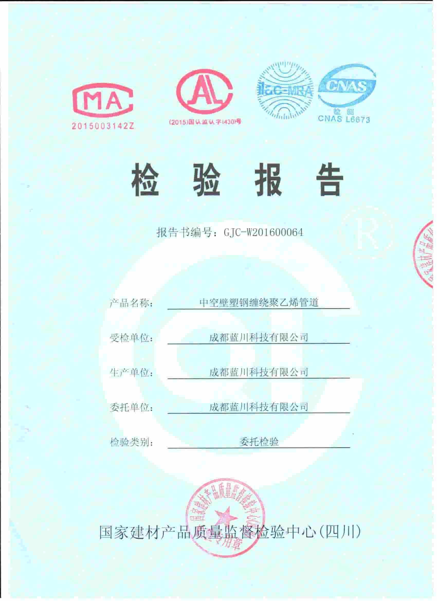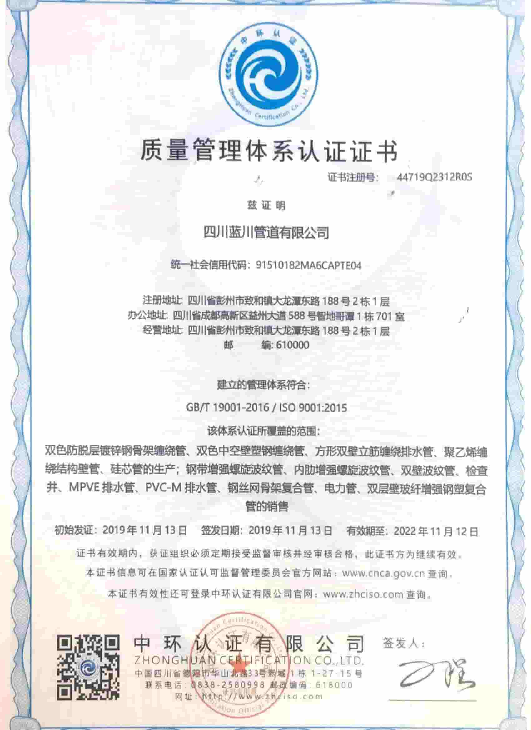 四川藍(lán)川管道有限公司(成都藍(lán)川科技有限公司)成立于2012年,生產(chǎn)基地坐落于“牡丹之城”四川彭州市工業(yè)開發(fā)區(qū),營運(yùn)中心位于成都市高新區(qū)益州大道,注冊資本5仟萬,占地面積2萬余平米,年生產(chǎn)能力達(dá)1萬噸以上;是一家專業(yè)研發(fā)、生產(chǎn)、銷售新型市政工程管道的高新技術(shù)企業(yè)。目前擁有大型市政排水管生產(chǎn)線5條,給水管生產(chǎn)線5條,電力管生產(chǎn)線2條。主要產(chǎn)品有:防脫層鍍鋅鋼骨架纏繞管、雙層壁克拉管、雙色中空壁塑鋼纏繞管、方形雙壁立筋纏繞管、內(nèi)肋管、雙壁波紋管、給水管、電力管、硅芯管等。 公司是四川省湖南商會“常務(wù)副會長單位”和“創(chuàng)新湘商”,中國塑料加工工業(yè)協(xié)會“塑料管道專業(yè)委員會會員單位”,獲得了30余項(xiàng)發(fā)明專利和實(shí)用新型專利,2020年評為《高新技術(shù)企業(yè)》,公司通過了《質(zhì)量管理體系認(rèn)證證書ISO9001:2015》,《職業(yè)健康安全管理體系認(rèn)證證書OHSAS18001:2018》,《環(huán)境管理體系認(rèn)證證書ISO14001:2015》;公司于2019年主編了《雙色防脫層玻璃纖維增強(qiáng)鍍鋅鋼骨架纏繞管》T/SCSX0906-2019,《雙壁纖維網(wǎng)鋼塑復(fù)合管》T/SCSX0916-2019,兩項(xiàng)團(tuán)體標(biāo)準(zhǔn),并獲得了四川建設(shè)科技發(fā)展中心頒發(fā)的《四川省建設(shè)領(lǐng)域科技成果或應(yīng)用技術(shù)備案證書》;公司“藍(lán)川”牌雙孔雙色共擠中空壁塑鋼纏繞聚乙烯管道、GSRC雙色雙層共擠玻纖增強(qiáng)防脫層鍍鋅鋼骨架纏繞管、方形雙壁立筋纏繞管、玻璃纖維增強(qiáng)內(nèi)肋硅芯層塑料電纜導(dǎo)管系列產(chǎn)品多次被中國企業(yè)發(fā)展促進(jìn)委員會、中國優(yōu)質(zhì)品牌統(tǒng)計(jì)中評定為“綠色環(huán)保推薦企業(yè)”、“工程建設(shè)推薦產(chǎn)品”、“質(zhì)量.服務(wù)誠信AAA企業(yè)”、“質(zhì)量檢驗(yàn).國家標(biāo)準(zhǔn)合格產(chǎn)品”、“中國自主創(chuàng)新產(chǎn)品”。