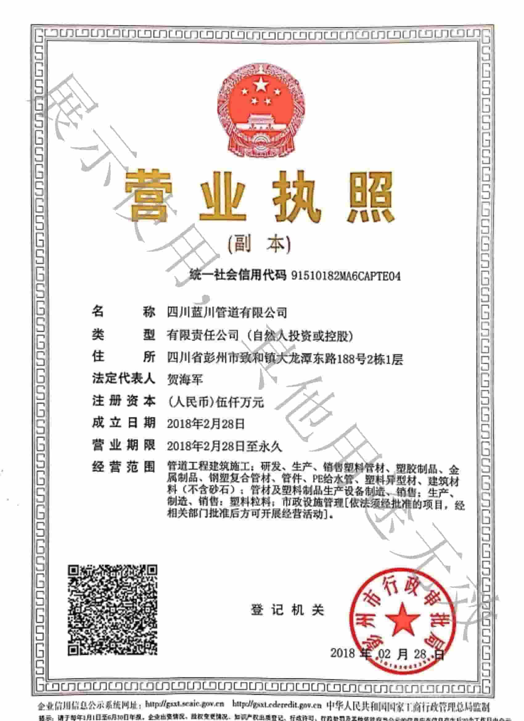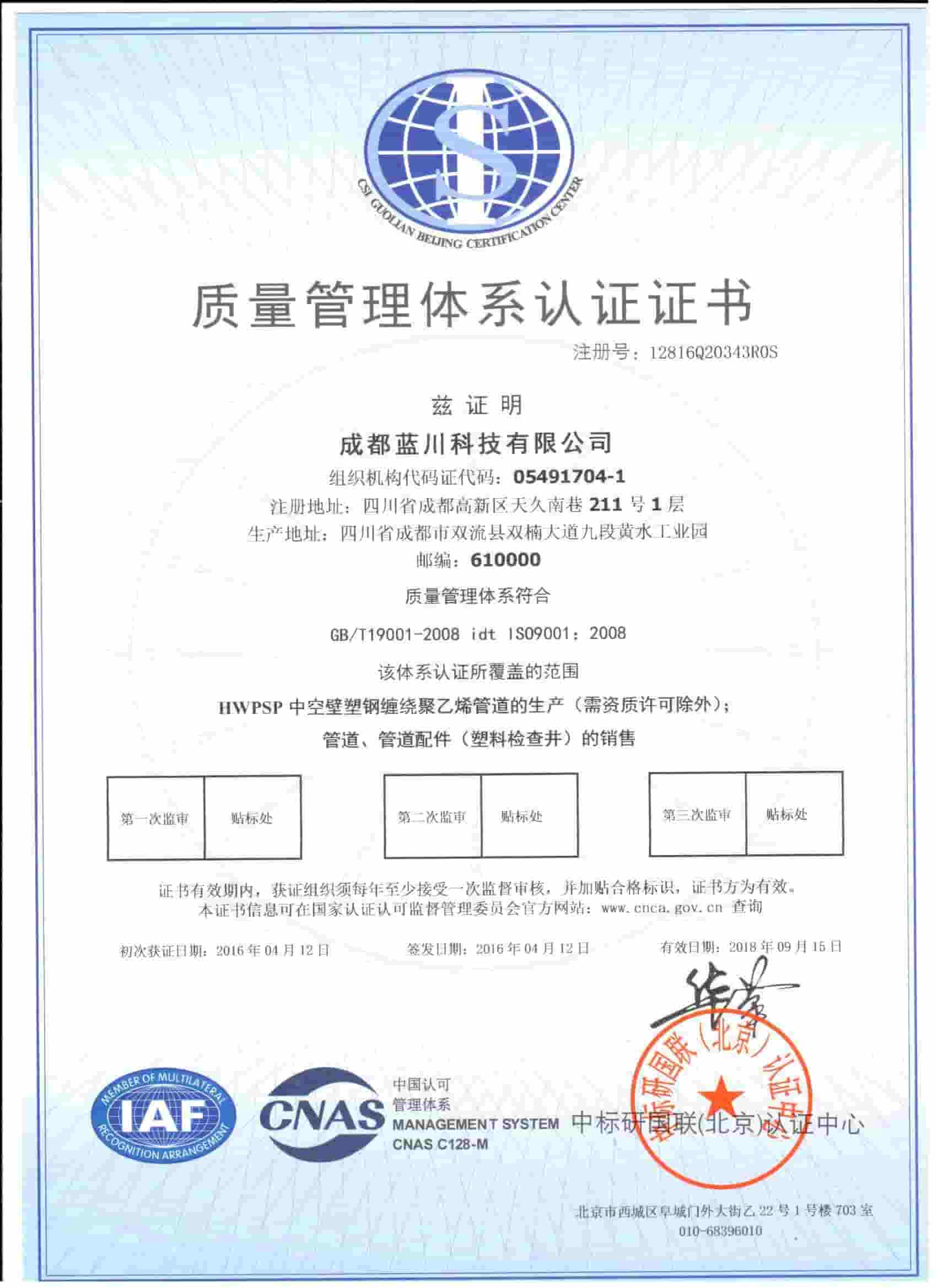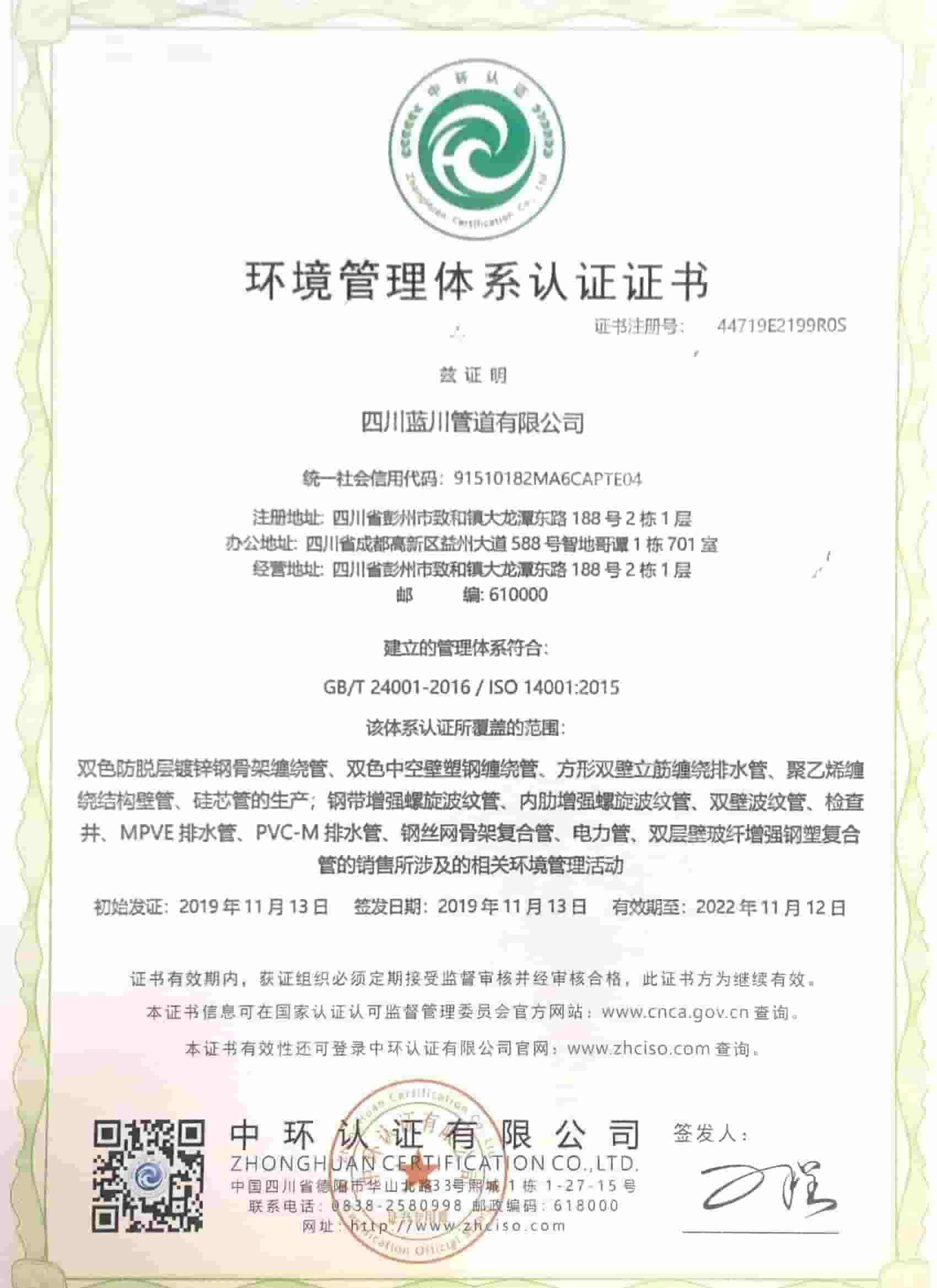 四川藍(lán)川管道有限公司(成都藍(lán)川科技有限公司)成立于2012年,生產(chǎn)基地坐落于“牡丹之城”四川彭州市工業(yè)開發(fā)區(qū),營運(yùn)中心位于成都市高新區(qū)益州大道,注冊資本5仟萬,占地面積2萬余平米,年生產(chǎn)能力達(dá)1萬噸以上;是一家專業(yè)研發(fā)、生產(chǎn)、銷售新型市政工程管道的高新技術(shù)企業(yè)。目前擁有大型市政排水管生產(chǎn)線5條,給水管生產(chǎn)線5條,電力管生產(chǎn)線2條。主要產(chǎn)品有:防脫層鍍鋅鋼骨架纏繞管、雙層壁克拉管、雙色中空壁塑鋼纏繞管、方形雙壁立筋纏繞管、內(nèi)肋管、雙壁波紋管、給水管、電力管、硅芯管等。 公司是四川省湖南商會“常務(wù)副會長單位”和“創(chuàng)新湘商”,中國塑料加工工業(yè)協(xié)會“塑料管道專業(yè)委員會會員單位”,獲得了30余項(xiàng)發(fā)明專利和實(shí)用新型專利,2020年評為《高新技術(shù)企業(yè)》,公司通過了《質(zhì)量管理體系認(rèn)證證書ISO9001:2015》,《職業(yè)健康安全管理體系認(rèn)證證書OHSAS18001:2018》,《環(huán)境管理體系認(rèn)證證書ISO14001:2015》;公司于2019年主編了《雙色防脫層玻璃纖維增強(qiáng)鍍鋅鋼骨架纏繞管》T/SCSX0906-2019,《雙壁纖維網(wǎng)鋼塑復(fù)合管》T/SCSX0916-2019,兩項(xiàng)團(tuán)體標(biāo)準(zhǔn),并獲得了四川建設(shè)科技發(fā)展中心頒發(fā)的《四川省建設(shè)領(lǐng)域科技成果或應(yīng)用技術(shù)備案證書》;公司“藍(lán)川”牌雙孔雙色共擠中空壁塑鋼纏繞聚乙烯管道、GSRC雙色雙層共擠玻纖增強(qiáng)防脫層鍍鋅鋼骨架纏繞管、方形雙壁立筋纏繞管、玻璃纖維增強(qiáng)內(nèi)肋硅芯層塑料電纜導(dǎo)管系列產(chǎn)品多次被中國企業(yè)發(fā)展促進(jìn)委員會、中國優(yōu)質(zhì)品牌統(tǒng)計(jì)中評定為“綠色環(huán)保推薦企業(yè)”、“工程建設(shè)推薦產(chǎn)品”、“質(zhì)量.服務(wù)誠信AAA企業(yè)”、“質(zhì)量檢驗(yàn).國家標(biāo)準(zhǔn)合格產(chǎn)品”、“中國自主創(chuàng)新產(chǎn)品”。