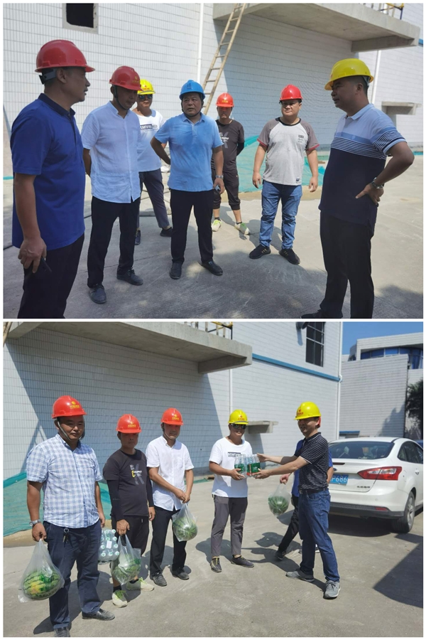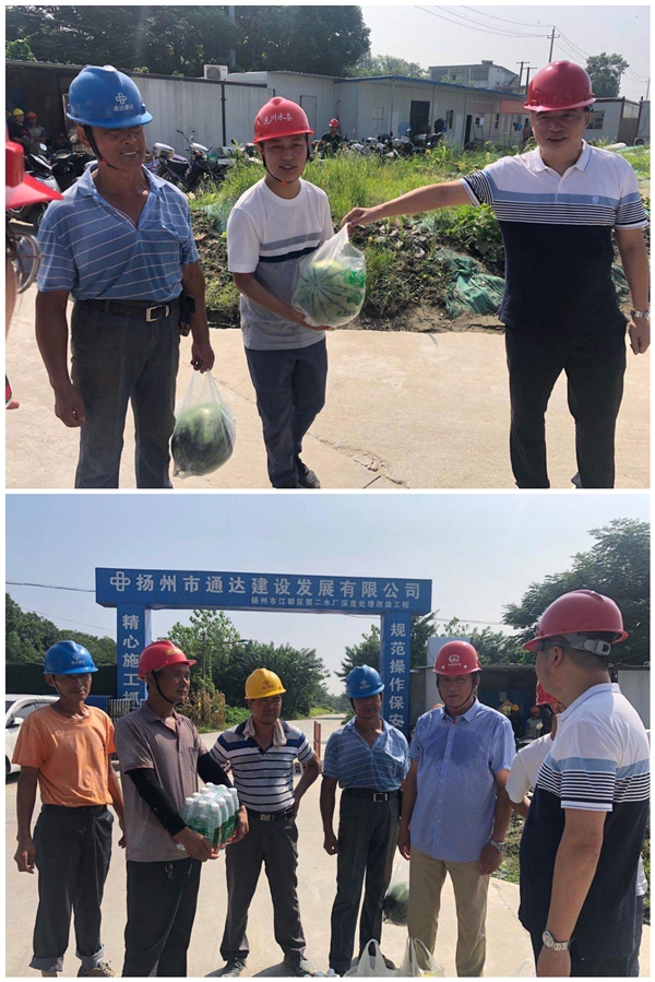 近日來(lái),揚(yáng)城開(kāi)啟了“燒烤”模式,為做好高溫季節(jié)防暑降溫工作,切實(shí)保障廣大施工人員的安全健康,有效促進(jìn)重點(diǎn)工程建設(shè),8.18日上午,在龍川控股集團(tuán)副總兼公司執(zhí)行董事張勇帶領(lǐng)下,集團(tuán)與公司黨政工領(lǐng)導(dǎo)代表頂著酷暑,帶著慰問(wèn)品來(lái)到二、三水廠深度處理改造工程項(xiàng)目施工現(xiàn)場(chǎng),對(duì)在高溫下作業(yè)的建設(shè)者進(jìn)行親切慰問(wèn)。