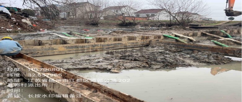郭村鎮(zhèn)新建橋梁工程時,損壞了DN1000自來水管道,由于損壞的管線較深,管道埋設(shè)于河道底部約3m,維修段河道寬度約為20m,且位于河道內(nèi),維修難度很大,結(jié)合現(xiàn)場實際情況,我公司決定采用草袋圍堰+拉伸鋼板樁對管線兩側(cè)進(jìn)行支護(hù)開挖維修施工方案,另考慮到本次施工區(qū)域北側(cè)有居民建筑物,采用靜壓力植樁機(jī)作為打樁設(shè)備。